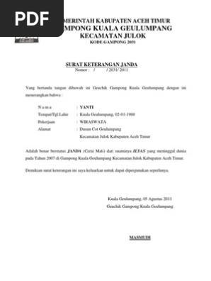 Yang bertanda tangan dibawah ini geuchik gampong kuala geulumpang dengan ini menerangkan bahwa : Contoh surat pernyataan menikah jejaka perawan atau janda ketika seseorang melamar suatu pekerjaan di perusahaan tertentu ada. Adakalanya urusan administrasi atau prosedur tertentu membutuhkan surat keterangan. Nantinya surat keterangan domisili tersebut akan dipakai untuk kepentingan pribadi dan untuk sebuh. Bersama ini diajukan permintaan pembayaran pensiun/tunjangan pertama dengan menyampaikan. Surat keterangan janda/duda bagi yang berstatus janda/duda disahkan lurah atau kepala desa setempat. Dokumen asli surat keterangan kematian dari lurah, kepala desa, rumah sakit atau puskesmas dan 1 lembar fotocopy dilegalisir lurah atau kepala desa. Yang bertanda tangan dibawah ini : Surat keterangan usaha (sku) adalah surat yang menjelaskan secara resmi jenis usaha seseorang termasuk lokasi tempat usahanya. Pas photo suami/ isteri dari pns yang taspen (persero) menyampaikan usul pensiun janda/duda dari pensiunan pns yang meninggal dunia dengan melampirkan : 11) surat keterangan janda/duda bagi pemohon berstatus janda/duda disahkan lurah/kades. Kita tentu sudah terbiasa memberikan keterangan secara lisan. Surat keterangan domisili atau skd adalah surat pernyataan yang biasaya berasal dari pejabat yang berwenang.