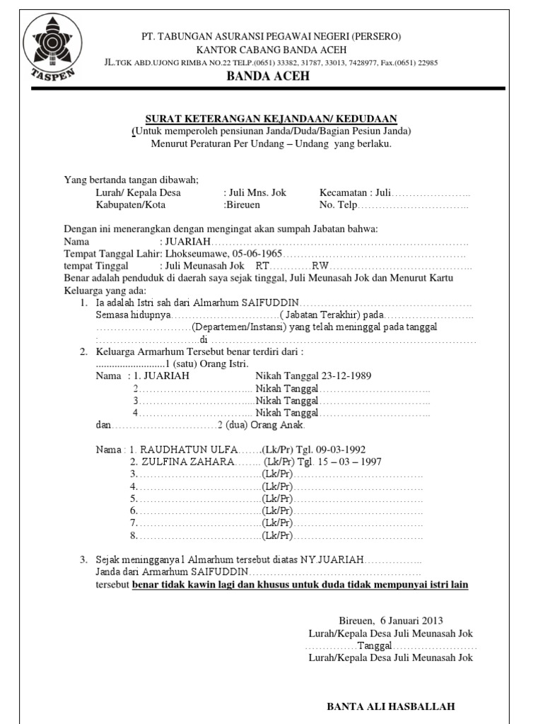 Contoh Surat Keterangan Janda from imgv2-1-f.scribdassets.com Surat keterangan kerja akan menjadi bukti tertulis bahwa yang menunjukan bahwa kamu pernah bekerja pada perusahaan tersebut dan biasanya digunakan untuk mendaftar kerja di tempat lain atau sebagai pelengkap administrasi lainnya. Contoh surat permintaan pembayaran pensiun (taspen). Surat keterangan waktu melaksanakan tugas. Yang bertanda tangan dibawah ini : 11) surat keterangan janda/duda bagi pemohon berstatus janda/duda disahkan lurah/kades. Demikian surat keterangan ini kami buat dengan sebenarnya untuk dapat dipergunakan seperlunya. Persyaratan pengajuan klaim pengajuan pensiun janda / duda, dari penerima pensiun pegawai · mengisi formulir permintaan pembayaran (fpp); Nantinya surat keterangan domisili tersebut akan dipakai untuk kepentingan pribadi dan untuk sebuh.
