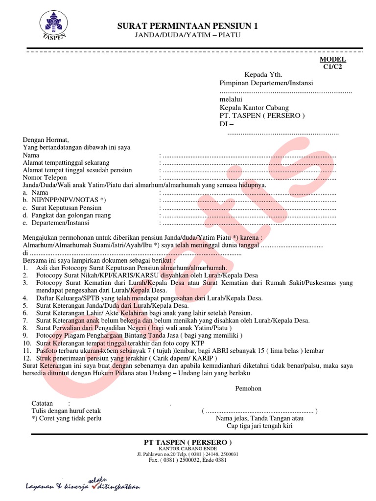 Sosialisasi Pt Taspen Persero Tentang Hak Dan Kewajiban Layanan Klaim Otomatis Denpasar Rabu 19 Jun Ppt Download from slideplayer.info Pensiunan pns keberatan taspen dilebur ke bpjs tk, ini alasannya. Bersama ini diajukan permintaan pembayaran pensiun/tunjangan pertama dengan menyampaikan. Surat keterangan waktu melaksanakan tugas. Surat undangan pengambilan sumpah pns. Surat keterangan janda/duda yang telah di isi dan disahkan oleh serendah rendahnya kepala kelurahan/kepala desa + 1 lembar foto copynya 4. Demikian surat keterangan ini kami buat dengan sebenarnya untuk dapat dipergunakan seperlunya. Rekarenah oreng sampa bueng pajeu. Persyaratan pengajuan klaim pengajuan pensiun janda / duda, dari penerima pensiun pegawai · mengisi formulir permintaan pembayaran (fpp);